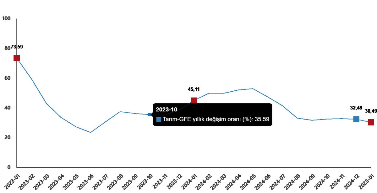 Bu verilere göre, 2025 yılı Ocak ayında bir önceki aya göre yüzde 5,89 artış, bir önceki yılın Aralık ayına göre yüzde 5,89 artış, bir önceki yılın aynı ayına göre yüzde 30,49 artış ve on iki aylık ortalamalara göre yüzde 39,58 artış gerçekleşti.