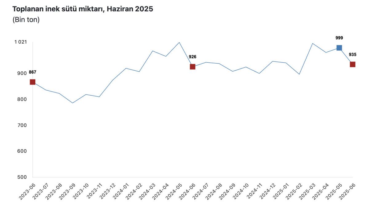Buna göre, toplanan inek sütü miktarı, haziranda yıllık bazda yüzde 0,9 yükselerek 934 bin 745 ton oldu.