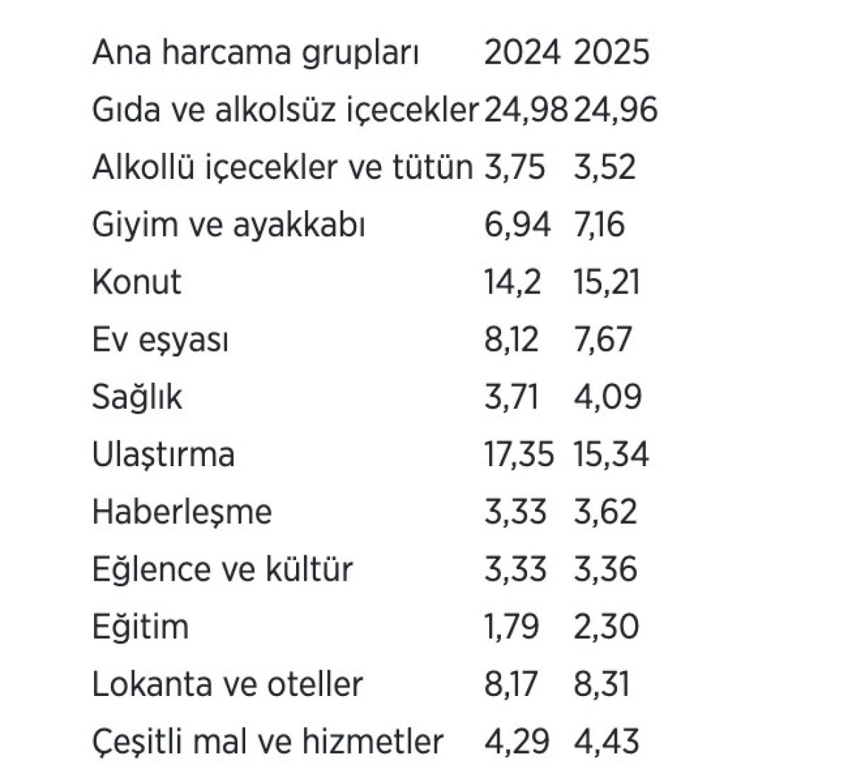 Buna göre, gıda ve alkolsüz içeceklerin ağırlığı yüzde 24,98’den yüzde 24,96’ya, ulaştırmanın ağırlığı 17,35’ten 15,34’e gerilerken, konutun ağırlığı yüzde 14,2’den yüzde 15,21’e yükseldi.