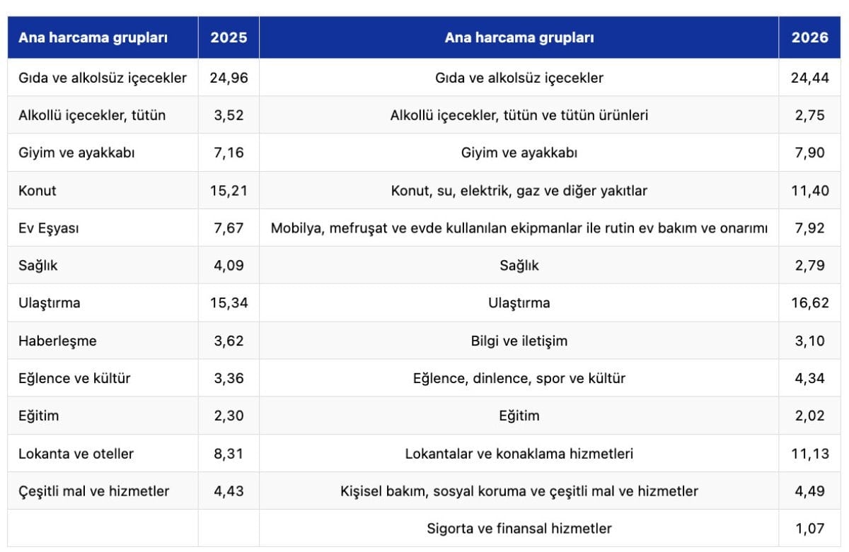 Yeni hesaplama döneminde gıda ve alkolsüz içeceklerin ağırlığı yüzde 24,44’e gerilerken, ulaştırmanın ağırlığı yüzde 16,62’ye yükseldi. Konut, su, elektrik, gaz ve diğer yakıtların ağırlığı ise yüzde 11,40 olarak belirlendi. Sigorta ve finansal hizmetler, yüzde 1,07 ağırlıkla yeni bir ana harcama grubu olarak TÜFE hesaplamasına dahil edildi.