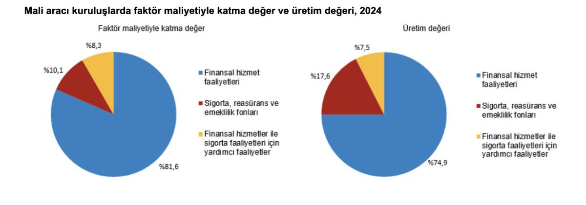 Faktör maliyetiyle katma değer 2024’te, bir önceki yıla göre finansal hizmet faaliyetlerinde yüzde 11,4, finansal hizmetler ile sigorta faaliyetleri için yardımcı faaliyetlerde yüzde 46,2, sigorta, reasürans ve emeklilik fonları faaliyetlerinde yüzde 173,6 yükseldi.