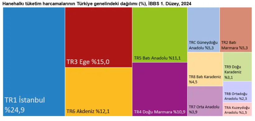 Araştırma sonuçlarına göre İBBS 2. Düzey bölgeleri itibarıyla, Türkiye’deki hanehalkı tüketim harcamalarının yüzde 24,9‘u TR10 (İstanbul) bölgesinde gerçekleşti. İkinci sırada yüzde 8,3 ile TR51 (Ankara) bölgesi yer alırken; bunu yüzde 6,4 ile TR31 (İzmir), yüzde 5,9 ile TR42 (Kocaeli, Sakarya, Düzce, Bolu, Yalova) bölgeleri izledi.