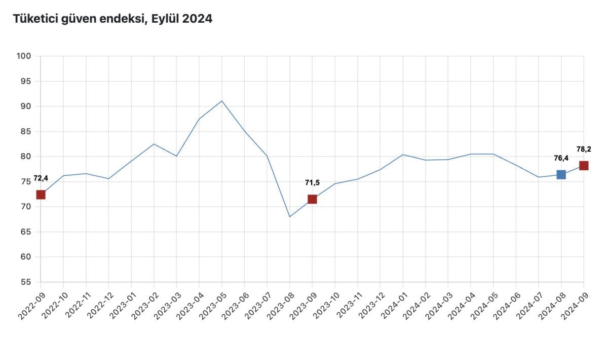 Türkiye İstatistik Kurumu ve Türkiye Cumhuriyet Merkez Bankası iş birliği ile yürütülen tüketici eğilim anketi sonuçlarından hesaplanan tüketici güven endeksi, ağustos ayında 76,4 iken eylül ayında yüzde 2,4 oranında artarak 78,2 oldu.