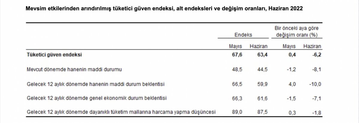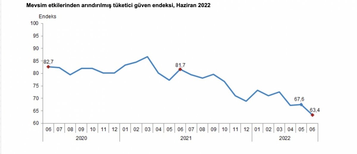 TÜİK’in web sitesinde açıklanan mevsim etkilerinden arındırılmış tüketici güven endeksi, haziran ayında bir önceki aya göre yüzde 6,2 oranında azaldı; mayıs ayında 67,6 olan endeks, haziran ayında 63,4 oldu.