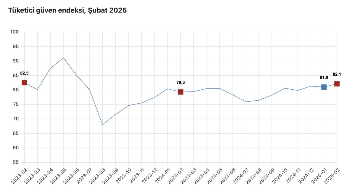 TÜİK ve Türkiye Cumhuriyet Merkez Bankası (TCMB) iş birliği ile yürütülen tüketici eğilim anketi sonuçlarından hesaplanan tüketici güven endeksi, ocak ayında 81 iken şubat ayında yüzde 1,4 oranında artarak 82,1 oldu.