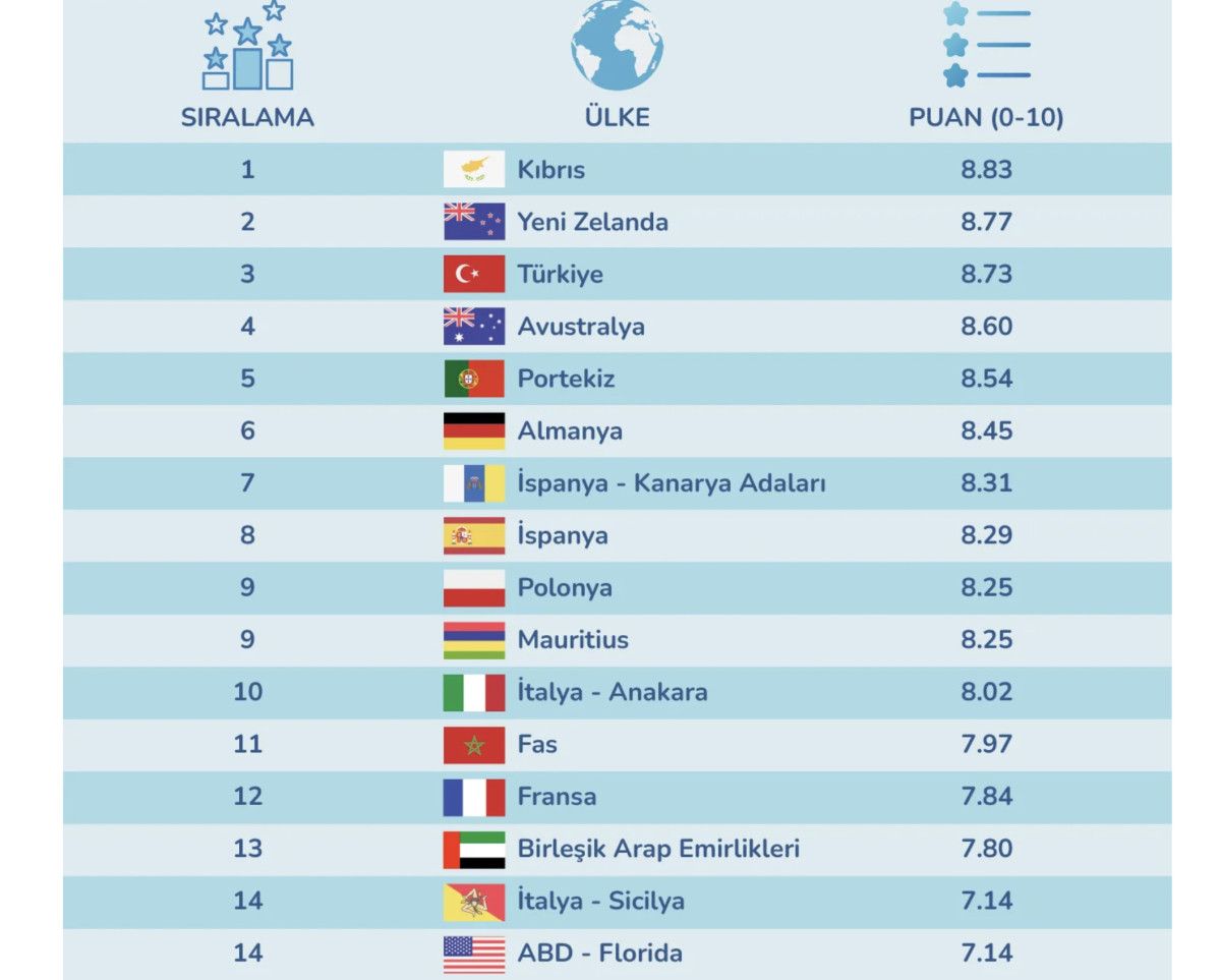 Yeni Zelanda 8,77 puanla ikinci sırada yer aldı.