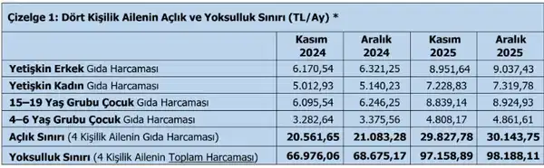 Yoksulluk sınırı olan gıda harcaması ile giyim, konut (kira, elektrik, su, yakıt), ulaşım, eğitim, sağlık ve benzeri ihtiyaçlar için yapılması zorunlu diğer aylık harcamalarının toplam tutarı 98 bin 188 TL oldu.