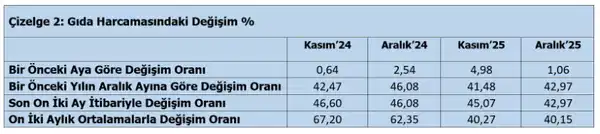 TÜRK-İŞ’ in verilerine göre “mutfak enflasyonu” verilerindeki değişim Aralık 2025 itibariyle şu şekilde oldu: