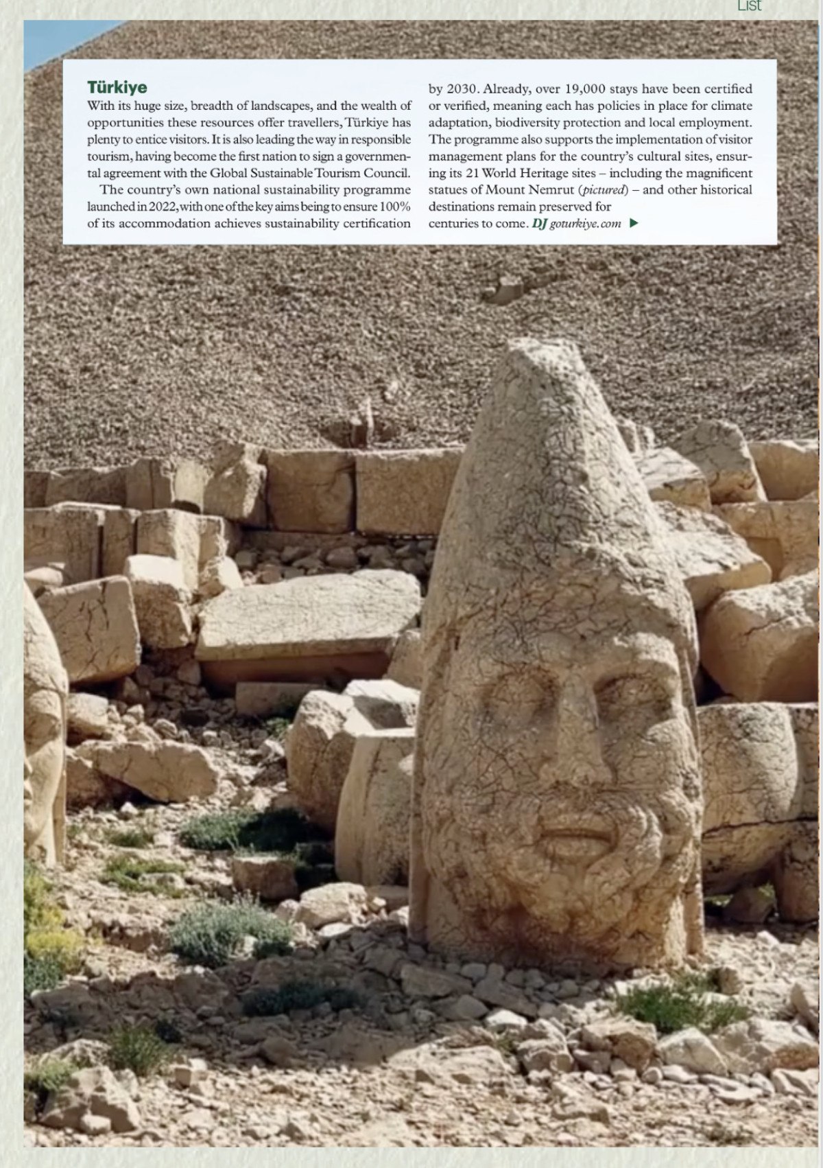 Türkiye’ye ayrılan özel sayfada, ülkenin sürdürülebilir turizmdeki liderliğine dikkat çekilirken UNESCO Dünya Mirası Listesi’nde yer alan Nemrut Dağı da dikkat çeken destinasyonlardan biri olarak öne çıkıyor.