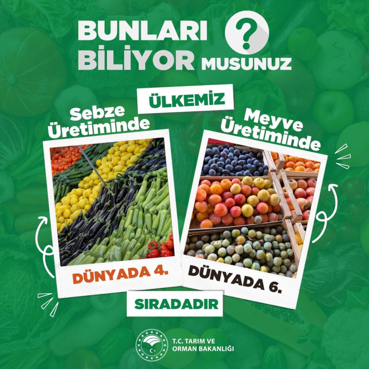Tarım ve Orman Bakanlığı, sosyal medya hesabı üzerinden Türkiye’nin sebze üretiminde dünya dördüncüsü ve meyve üretiminde ise dünya altıncısı olduğunu açıkladı.
