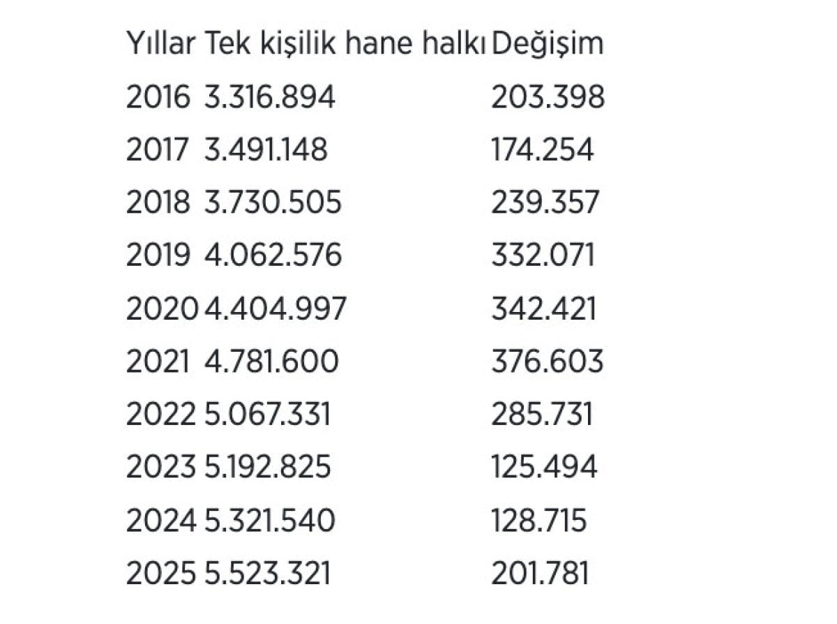 TÜİK verilerine göre, tek kişilik hane halkı sayısı ve değişimi (2016-2025) şöyle: