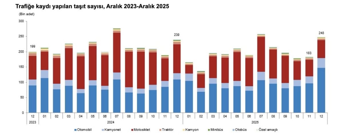 Aralık ayında 248 bin 205 adet taşıtın trafiğe kaydı yapıldı. Aralık ayında trafiğe kaydı yapılan taşıtların yüzde 59,3’ünü otomobil, yüzde 23,6’sını motosiklet, yüzde 12,9’unu kamyonet, yüzde 1,9’unu traktör, yüzde 1,2’sini kamyon, yüzde 0,6’sını minibüs, yüzde 0,3’ünü otobüs ve yüzde 0,2’sini özel amaçlı taşıtlar oluşturdu.