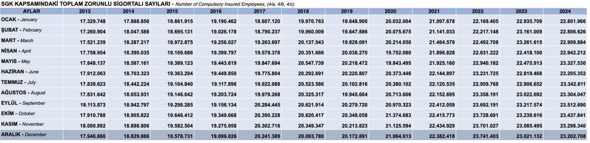 Bu sayıya çıraklar, muhtarlar, stajyer ve kursiyerler, tarımda kendi adına sigortalılar ve yurt dışı topluluk çalışanları da dahil bulunuyor.