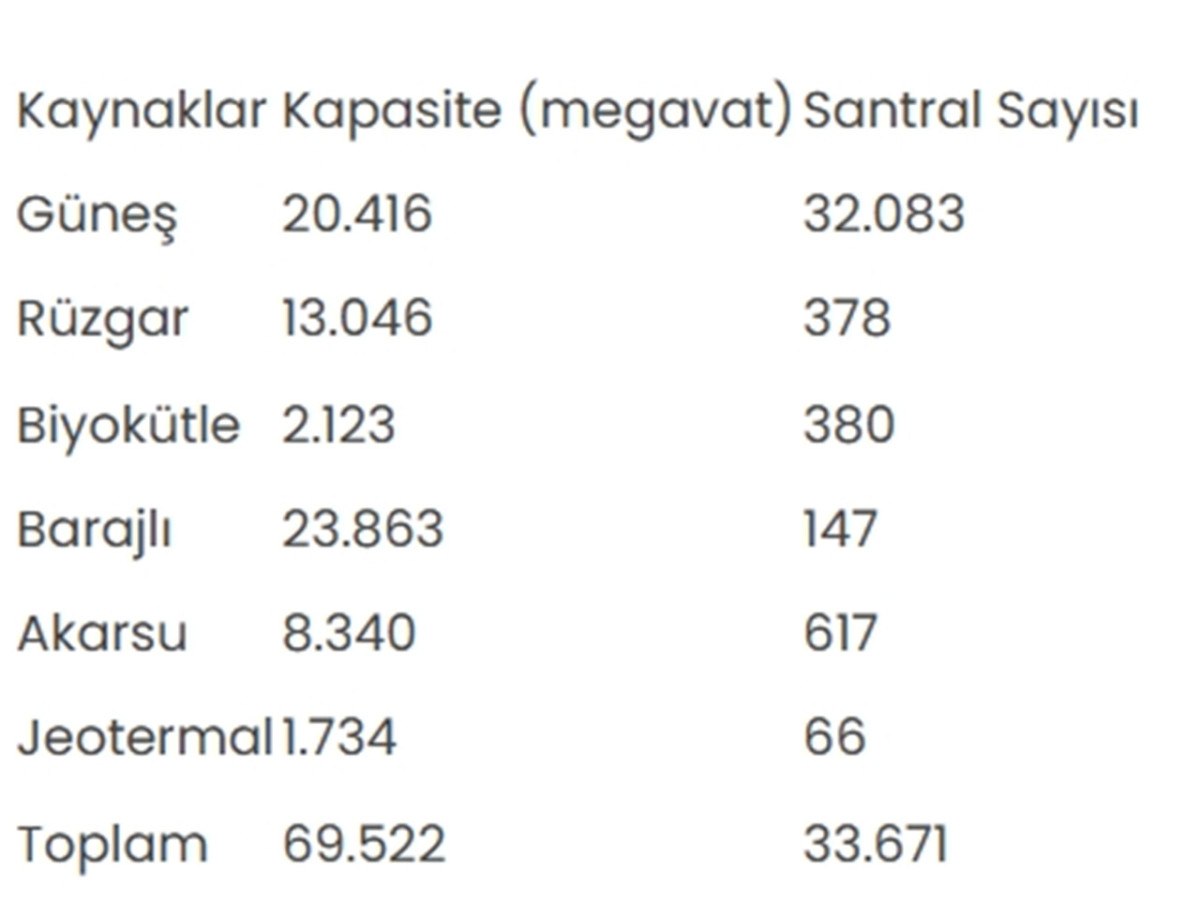 Yenilenebilir enerji kaynakları kapasite ve santral sayısı ise şöyle: