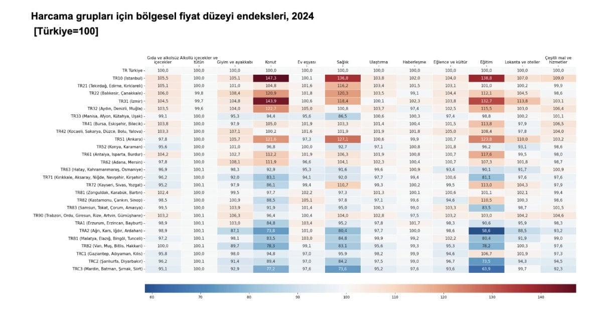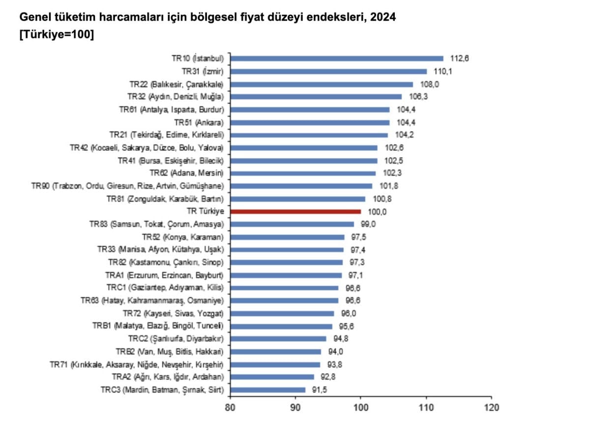 Bu endeks değerleri, TR10 (İstanbul)’un Türkiye ortalamasına göre yüzde 12,6 pahalı, TRC3 (Mardin, Batman, Şırnak, Siirt)’ün ise yüzde 8,5 daha ucuz olduğunu gösterdi.