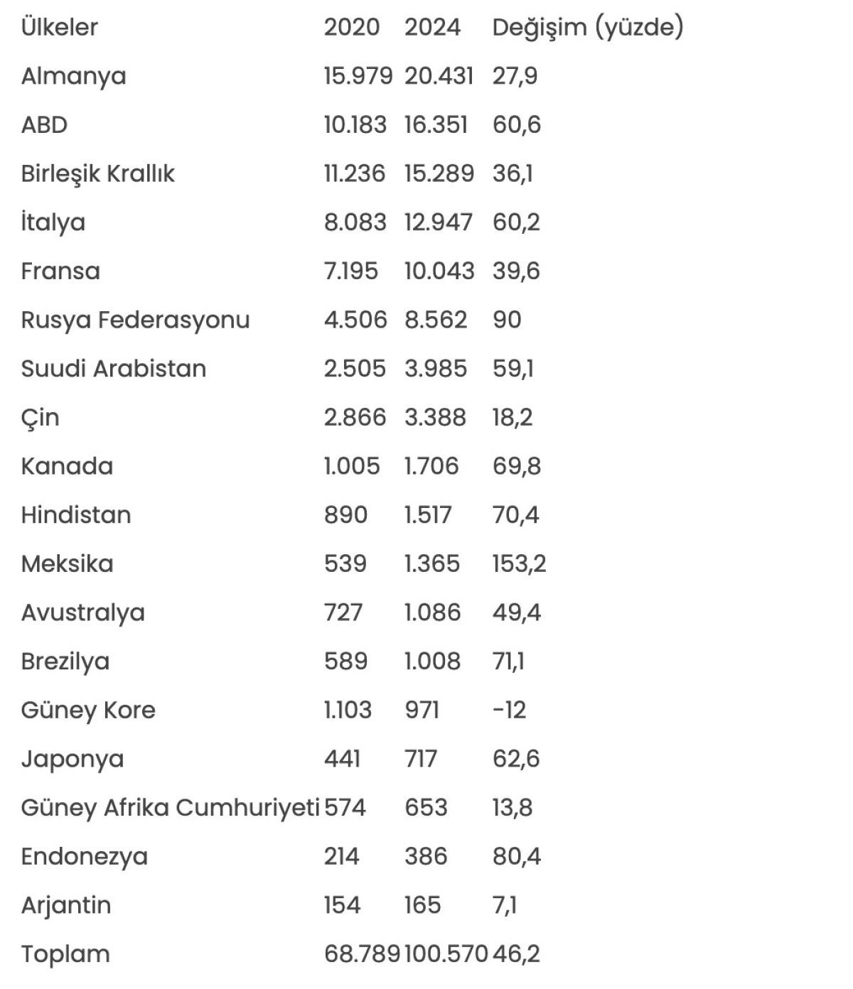 Türkiye’nin 2020 ve 2024 yıllarında söz konusu ülkelere gerçekleştirdiği ihracat (milyon dolar) ve değişim (yüzde) verileri şöyle: