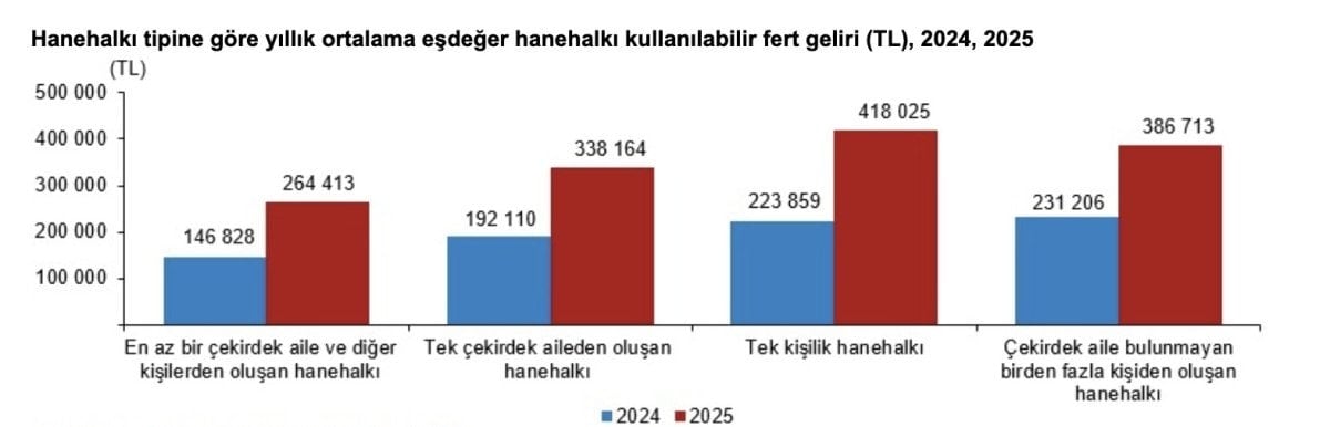 Yıllık ortalama eşdeğer hane halkı kullanılabilir fert gelirlerinde en yüksek gelir, geçen yıla göre 194 bin 166 TL artarak 418 bin 025 TL ile tek kişilik hane halklarının oldu. Çekirdek aile bulunmayan birden fazla kişiden oluşan hane halklarının yıllık ortalama eşdeğer hane halkı kullanılabilir fert geliri 386 bin 713 TL iken tek çekirdek aileden oluşan hane halklarında bu değer 338 bin 164 TL oldu. En düşük yıllık ortalama eşdeğer kullanılabilir hane halkı fert gelirine sahip hane halkı tipi ise 264 bin 413 TL ile en az bir çekirdek aile ve diğer kişilerden oluşan hane halkları oldu.