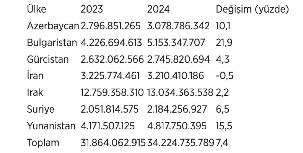 Türkiye’nin, komşuları Azerbaycan, Bulgaristan, Gürcistan, İran, Irak, Suriye ve Yunanistan’a yaptığı ihracat 2024’te, bir önceki yıla kıyasla yüzde 7,4 arttı.
