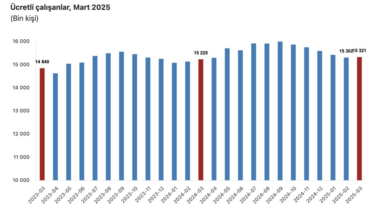 Ücretli çalışan sayısı bir önceki yılın aynı ayında 15 milyon 224 bin 973 kişi iken, 2025 yılı Mart ayında 15 milyon 320 bin 987 kişi oldu.