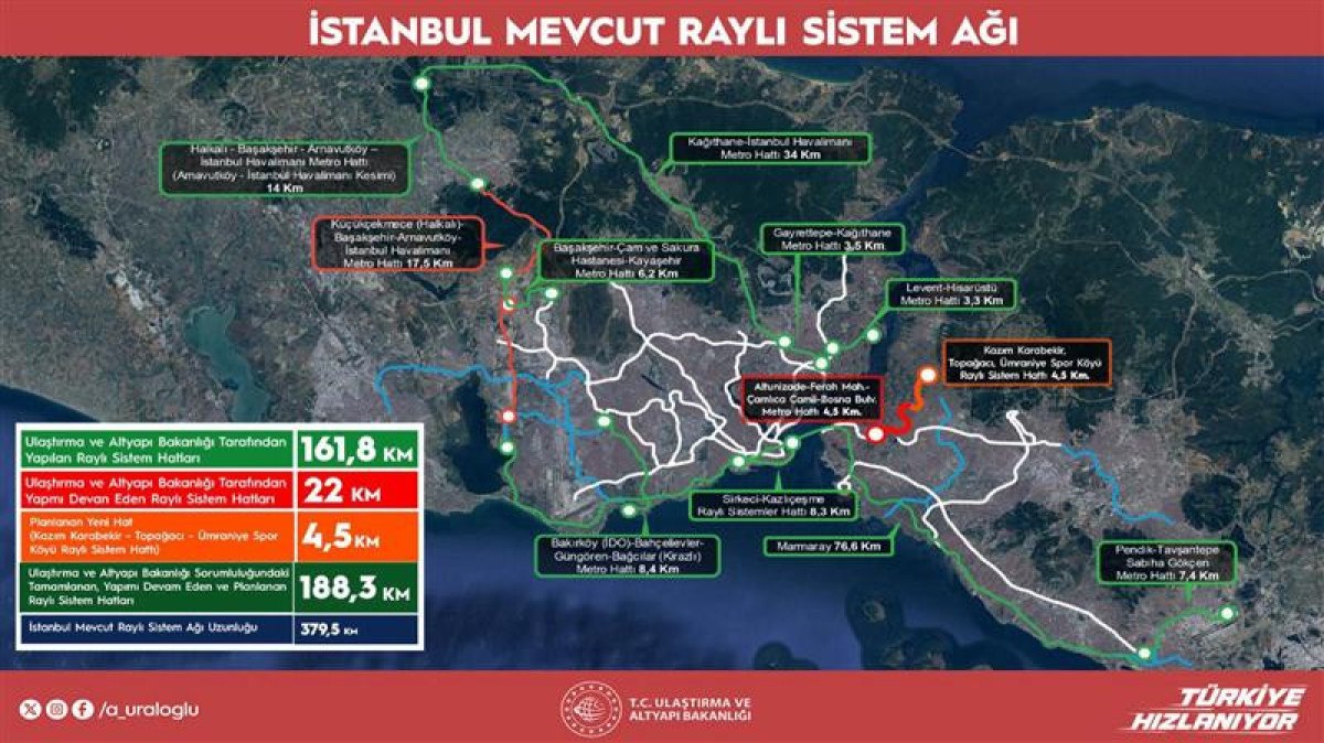 Ulaştırma ve Altyapı Bakanı Abdulkadir Uraloğlu, İstanbul’a kazandırılacak yeni hatla ilgili olarak açıklamada bulunarak, “Böylece, yapımı devam eden hat uzunluğumuz 26,5 kilometreye, İstanbul genelinde inşa ettiğimiz toplam hat uzunluğu ise 188 kilometreye ulaşacak.” dedi.