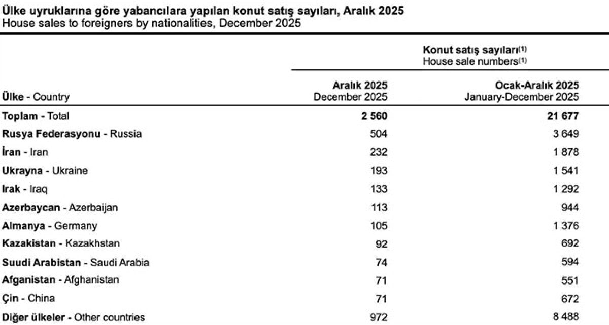 2025 yılında ülke uyruklarına göre en fazla konut satışı sırasıyla 3 bin 649 ile Rusya Federasyonu, 1.878 ile İran ve 1.541 ile Ukrayna vatandaşlarına yapıldı.