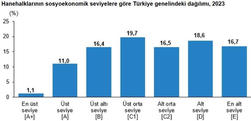 Araştırmaya göre Türkiye’de hanelerin yalnızca yüzde 1,1’i en üst sosyoekonomik seviyede bulunuyor. Hanelerin yüzde 11’i üst seviyede, yüzde 16,4’ü üst altı seviyede, yüzde 19,7’si üst orta seviyede, yüzde 16,5’i alt orta seviyede, yüzde 18,6’sı alt seviyede ve yüzde 16,7’si ise en alt seviyede yer alıyor.
