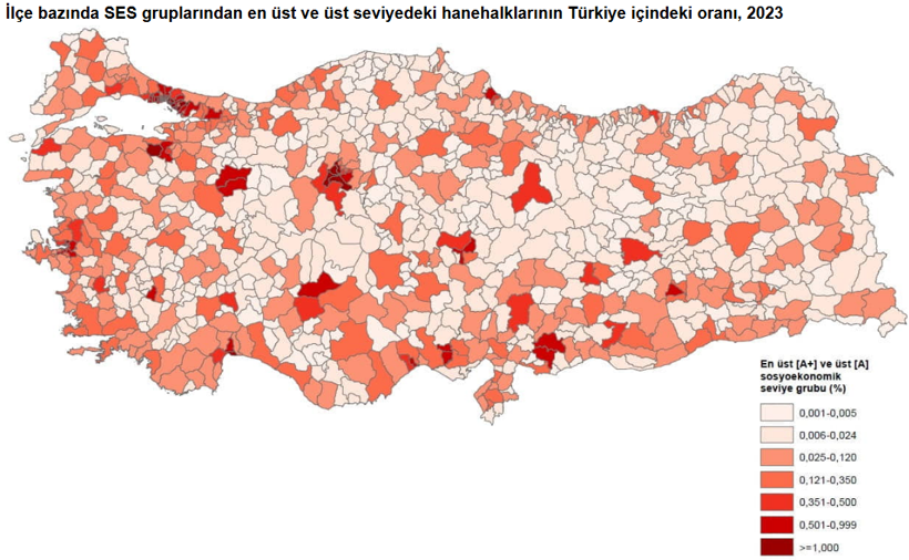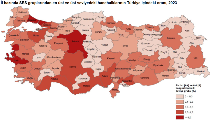 İllere göre dağılıma bakıldığında İstanbul, Ankara ve İzmir, üst düzey sosyoekonomik grupların yoğun olduğu merkezler olarak öne çıkıyor. En üst ve üst seviye grubundaki hanelerin yüzde 28,6’sı İstanbul’da, yüzde 11,5’i Ankara’da, yüzde 6,7’si İzmir’de, yüzde 3,9’u Bursa’da ve yüzde 3,3’ü Antalya’da bulunuyor.
