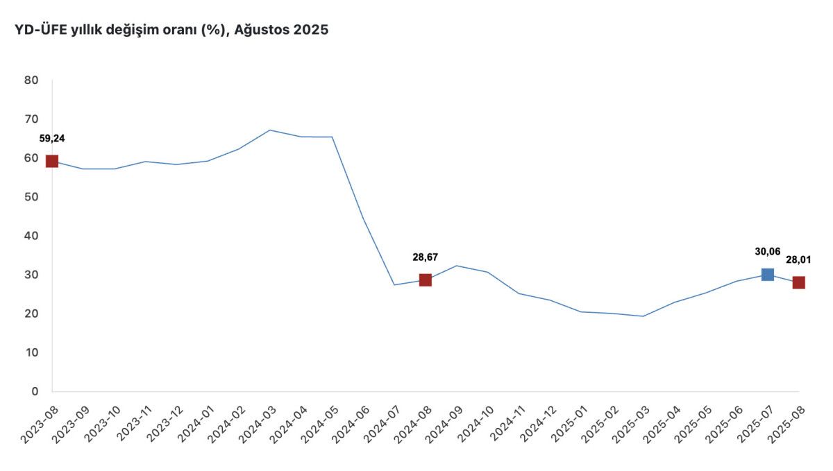 YD-ÜFE 2025 yılı Ağustos ayında bir önceki aya göre yüzde 1,32 artış, bir önceki yılın aralık ayına göre yüzde 25,03 artış, bir önceki yılın aynı ayına göre yüzde 28,01 artış ve on iki aylık ortalamalara göre yüzde 25,47 artış gösterdi.