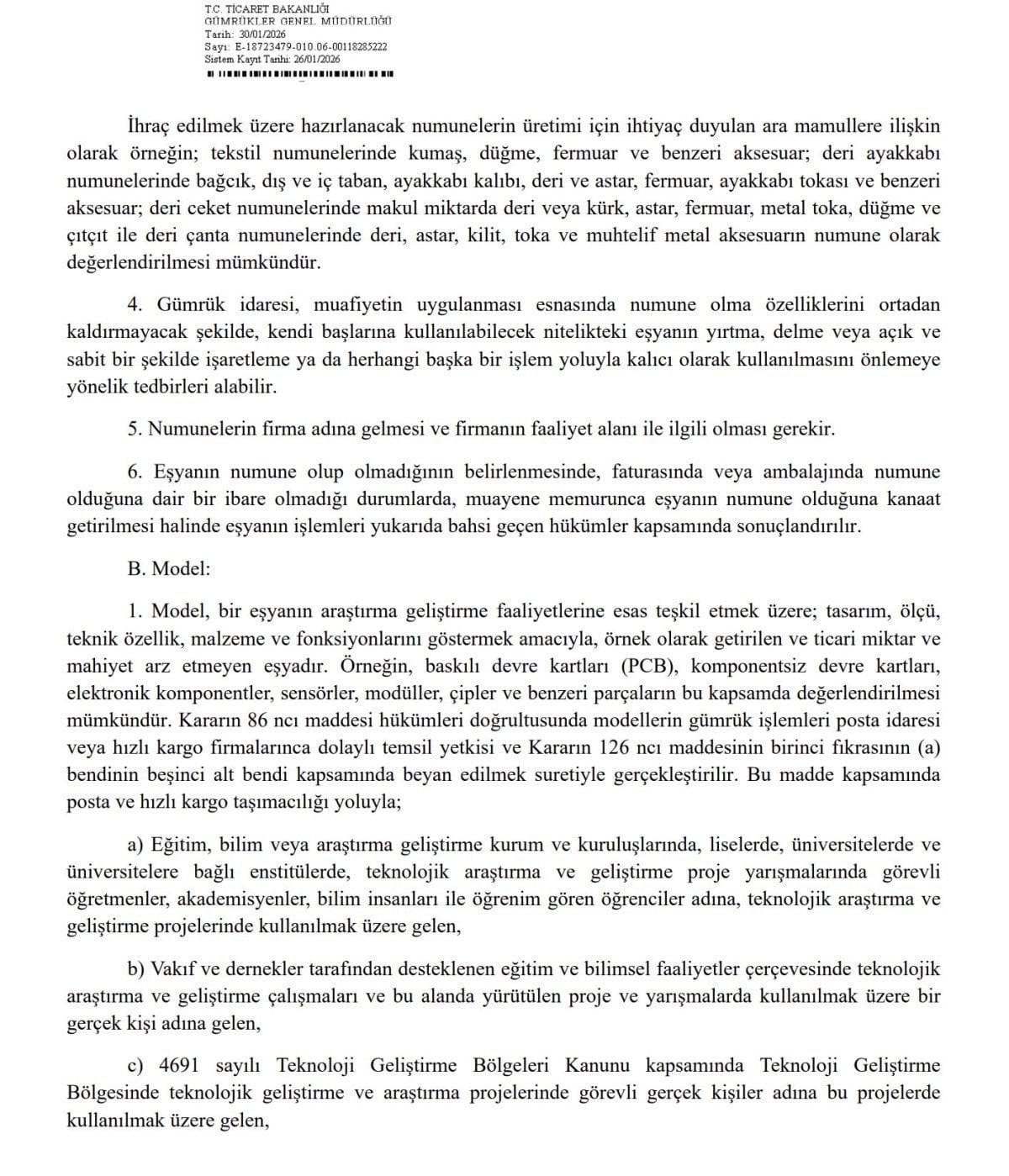 Genelgeye göre; üniversitelerde görev yapan akademisyenler, öğrenciler, Ar-Ge ve teknoloji geliştirme bölgelerinde çalışan personel belgelendirmek kaydıyla yurtdışından numunelik eşya getirebilecek.