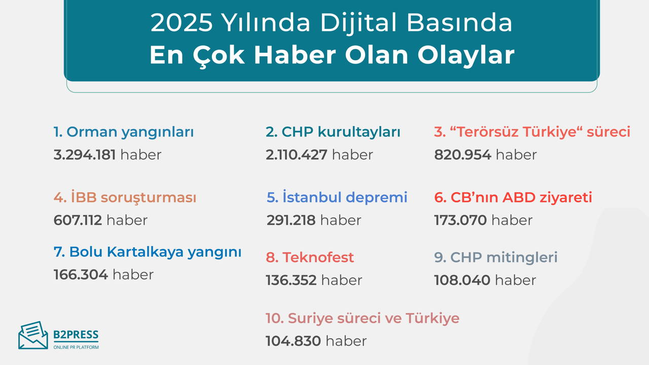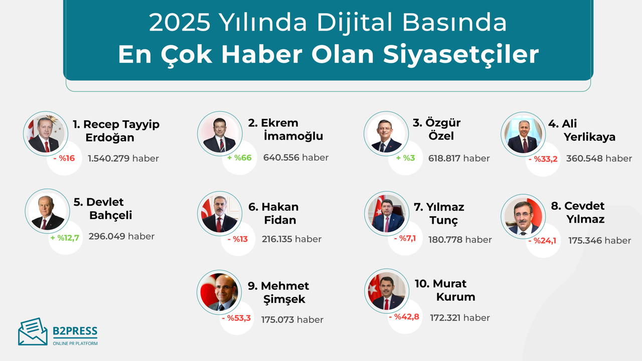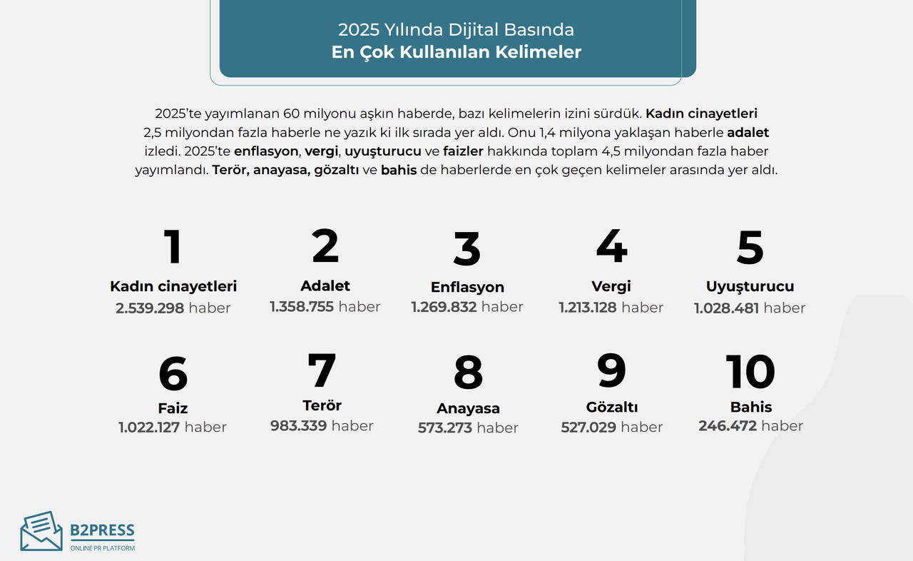 B2Press, 1 Ocak – 30 Aralık 2025 tarihleri arasında 20 bini aşkın online mecrada yayımlanan 60.864.567 haberi analiz ederek Türkiye’nin dijital medya karnesini çıkardı.