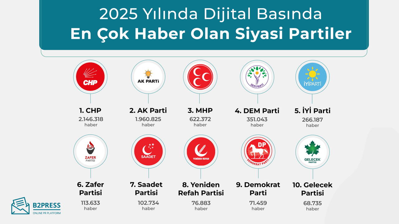 Siyasi gündemin yoğun olduğu 2025 yılında, hakkında en çok haber yapılan siyasi parti 2.146.318 haberle Cumhuriyet Halk Partisi (CHP) oldu. CHP’yi, 1.960.825 haberle AK Parti ve 622.372 haberle MHP izledi.