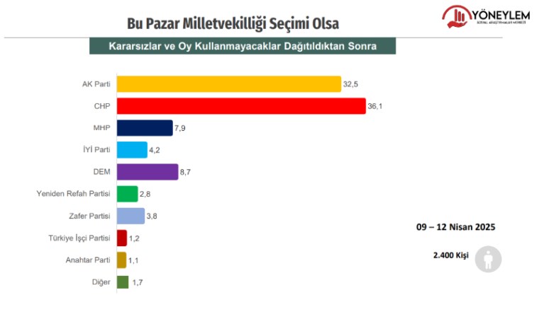 Söz konusu anketin sonuçlarına göre, Bu Pazar milletvekilliği seçimi olsa hangi partiyi destekleyecekleri sorusuna katılımcılar yüzde 36.1 oy oranıyla CHP yanıtını verdi.