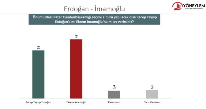 “Önümüzdeki Pazar Cumhurbaşkanlığı seçimi 2. turu yapılacak olsa Recep Tayyip Erdoğan’a mı Ekrem İmamoğlu’na mı oy verirsiniz?” sorusunda ankete katılanların yüzde 48’i Ekrem İmamoğlu yanıtını verdi. AKP’li Cumhurbaşkanı Recep Tayyip Erdoğan ise yüzde 39 oyda kaldı.