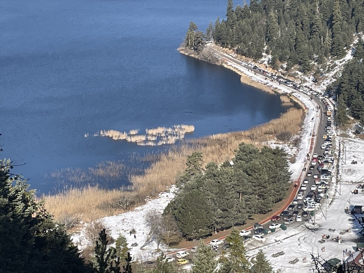 Bir bölümü karla kaplı olan milli parkın girişi ile göl çevresinde ziyaretçiler nedeniyle araç yoğunluğu oluştu.