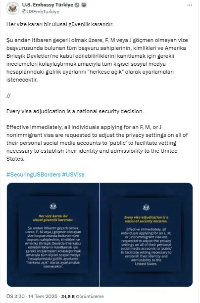 “Şu andan itibaren geçerli olmak üzere, F, M veya J göçmen olmayan vize başvurusunda bulunan tüm başvuru sahiplerinin, kimlikleri ve Amerika Birleşik Devletleri’ne kabul edilebilirliklerini kanıtlamak için gerekli incelemeleri kolaylaştırmak amacıyla tüm kişisel sosyal medya hesaplarındaki gizlilik ayarlarını “herkese açık” olarak ayarlamaları istenecektir.”