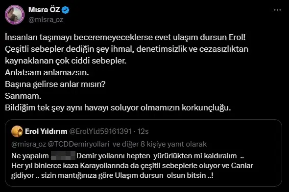 Öz, “İnsanları taşımayı beceremeyeceklerse evet ulaşım dursun Erol! Çeşitli sebepler dediğin şey ihmal, denetimsizlik ve cezasızlıktan kaynaklanan çok ciddi sebepler. Anlatsam anlamazsın. Başına gelirse anlar mısın? Sanmam. Bildiğim tek şey aynı havayı soluyor olmamızın korkunçluğu” ifadelerini kullandı.