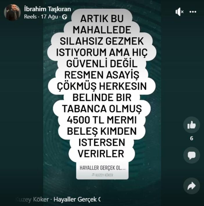 Sosyal medya hesabından “Artık bu mahallede silahsız gezmek istiyorum ama hiç güvenli değil. Resmen asayiş çökmüş. Herkesin belinde bir tabanca olmuş 4 bin 500 TL. Mermi bedava.Kimden istesen verirler” paylaşımı yapan İbrahim Taşkıran, 1 Eylül’de aynı caddede uğradığı silahlı saldırıda hayatını kaybetmişti.