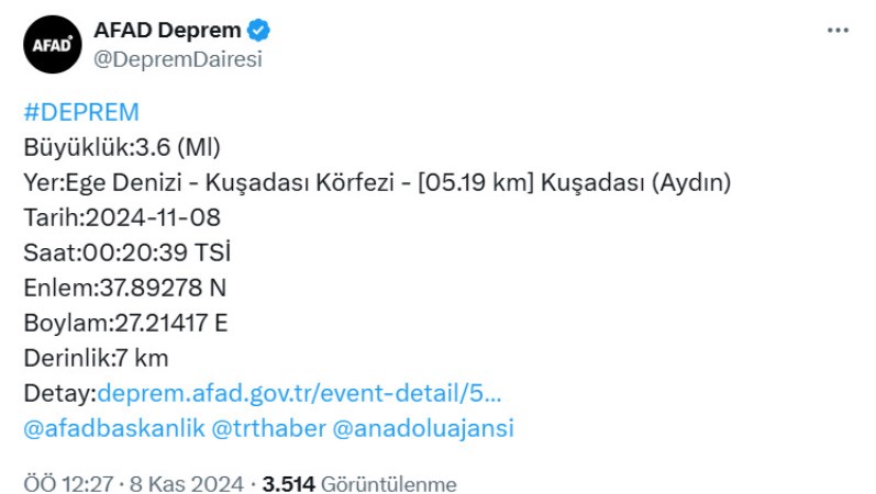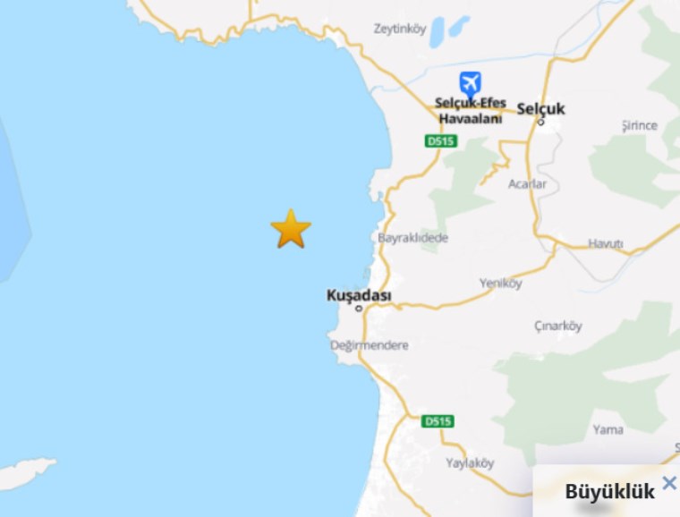 Derinliği 7 km olarak duyurulan depremin Kuşadası’na yakınlığı 5.19 km olarak açıklandı.