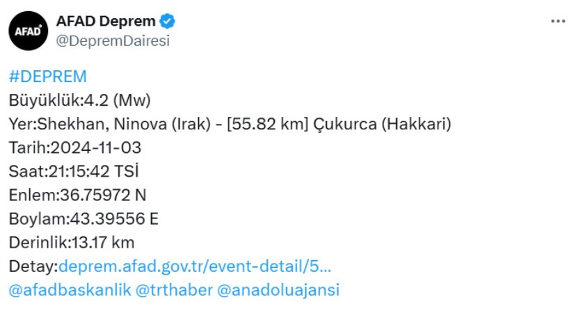 AFAD (Afet ve Acil Durum Yönetimi Başkanlığı) Irak’ın Shekhan, Ninova bölgesinde 4.2 büyüklüğünde deprem meydana geldiğini açıkladı.
