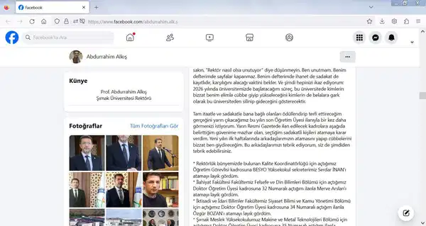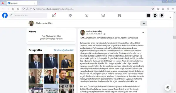 Şırnak Üniversitesi Rektörü Prof. Dr. Abdurrahim Alkış’ın 30 Aralık 2025 tarihinde sosyal medya hesabından yaptığı paylaşımında personele yönelik uyarılarda bulunarak akademik atamalarda “sadakat” kriterinden bahsetti.