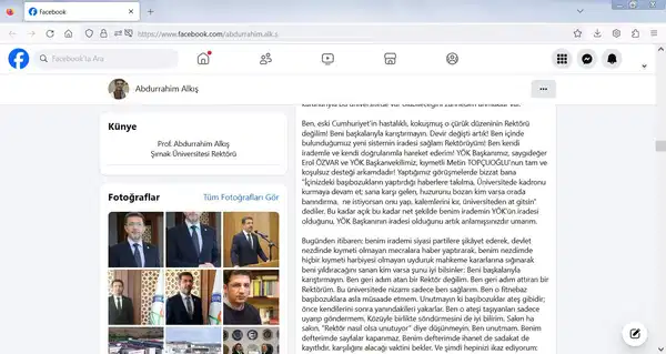 Kişisel sosyal medya hesabından paylaşım yapan Rektör Alkış, “Bu üniversitede atamalar, yükseltmeler ve akademik kadrolar gösterilen sadakate göre benim rızam doğrultusunda verilir” dedi.