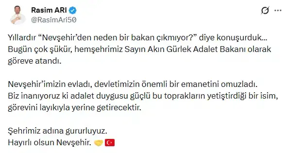 Arı, Gürlek atamasını, “Bugün çok şükür, hemşehrimiz Sayın Akın Gürlek Adalet Bakanı olarak göreve atandı. Nevşehir’imizin evladı, devletimizin önemli bir emanetini omuzladı. Biz inanıyoruz ki adalet duygusu güçlü bu toprakların yetiştirdiği bir isim, görevini layıkıyla yerine getirecektir. Şehrimiz adına gururluyuz” ifadeleri ile paylaşmıştı.
