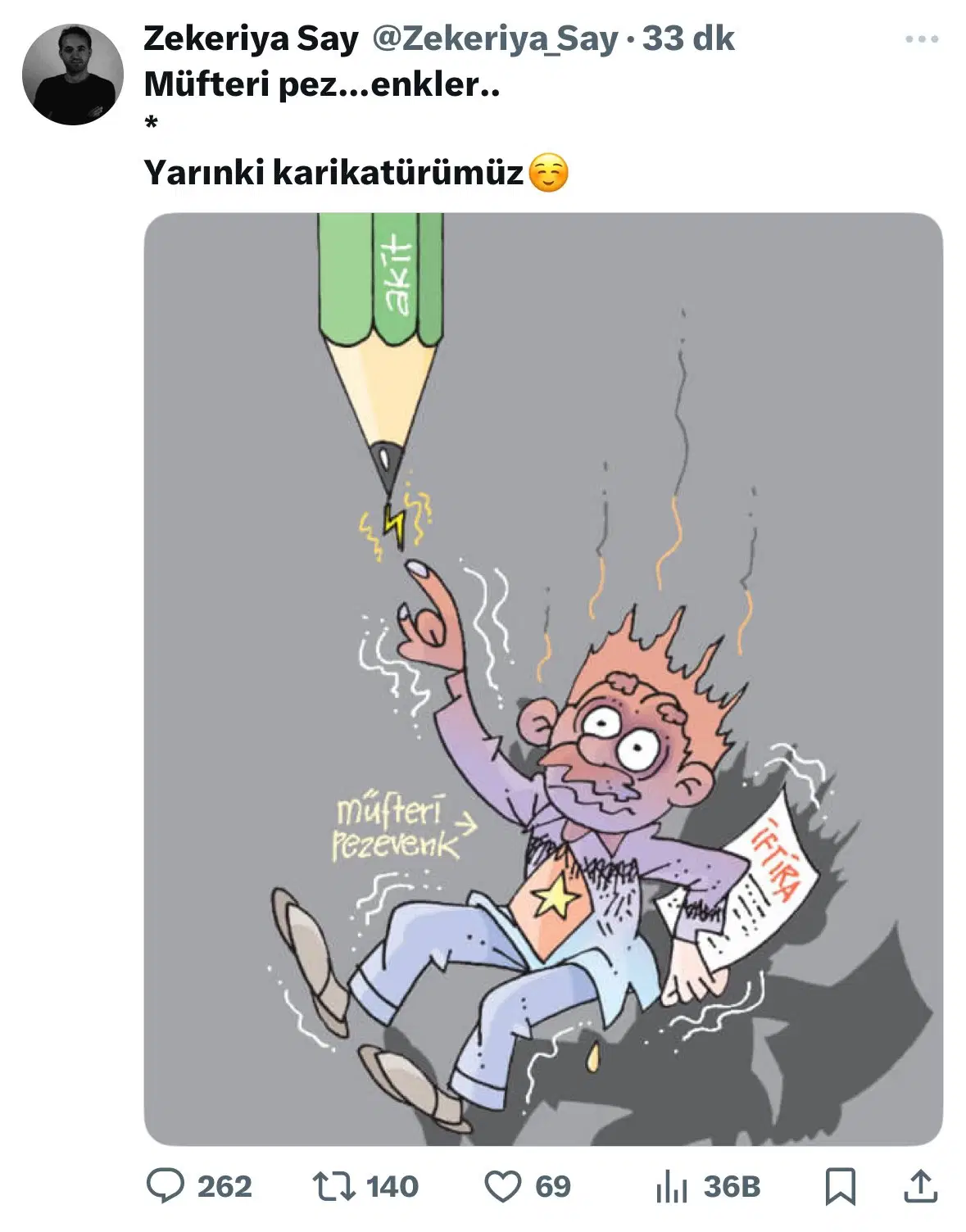 Yeni Akit haber Müdürü Zekeriya Say, sosyal medya hesabından elektrik akımı görseli yer alan profil fotoğrafı paylaştı. Say, tepkilerin ardından kısa süre sonra paylaşımı sildi.