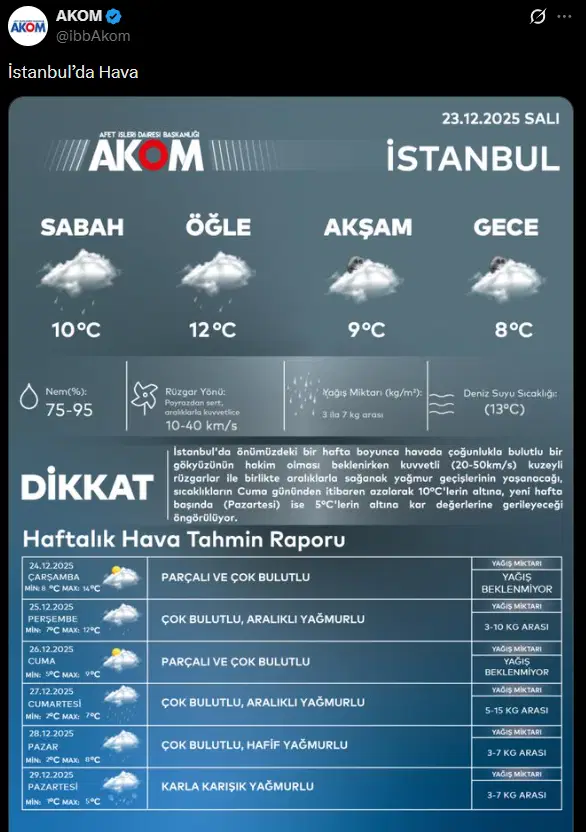 İstanbul Büyükşehir Belediyesi (İBB) Afet Koordinasyon Merkezi (AKOM), kentin haftalık hava tahmin raporunu paylaştı.