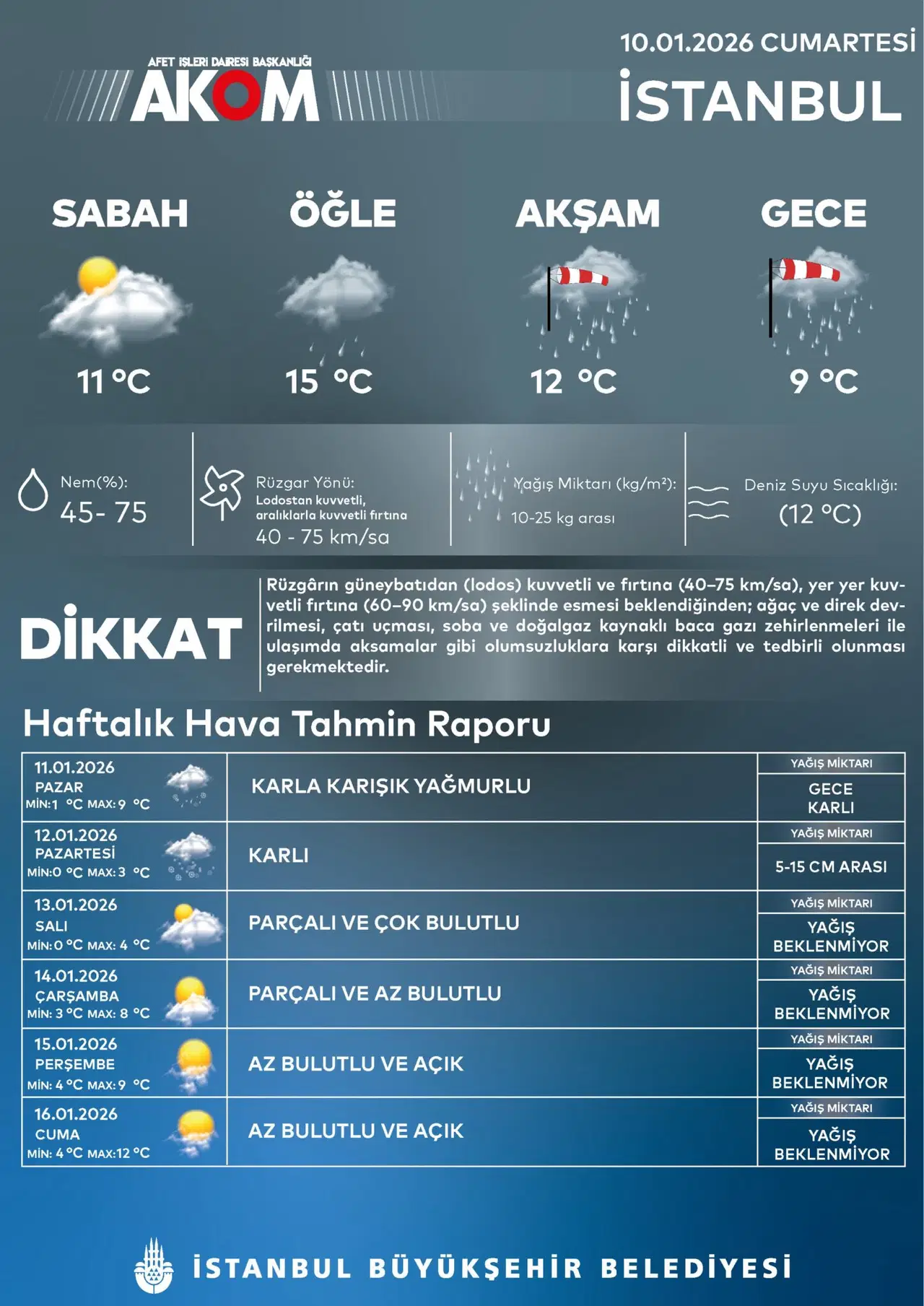 Cumartesi günü (bugün) lodos yönünden esen rüzgarın hızının 40-75 km/sa aralığında olması, zaman zaman ise 60-90 km/sa kuvvetinde fırtınaya dönüşmesi bekleniyor.