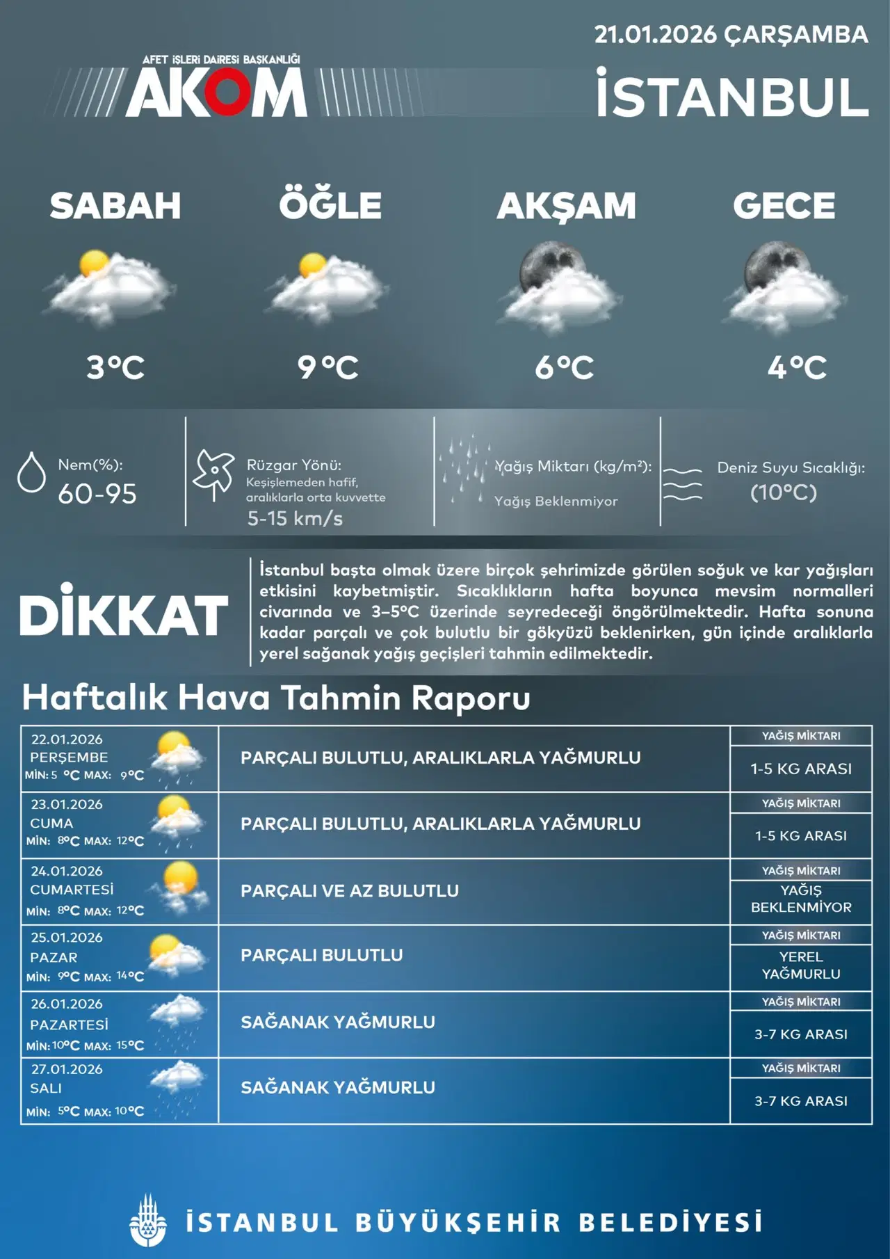AKOM’un “Dikkat” notunda; soğuk hava dalgasının etkisini kaybettiği, sıcaklıkların hafta boyunca mevsim normalleri civarında, hatta yer yer 3-5 derece üzerinde seyredeceği belirtildi.