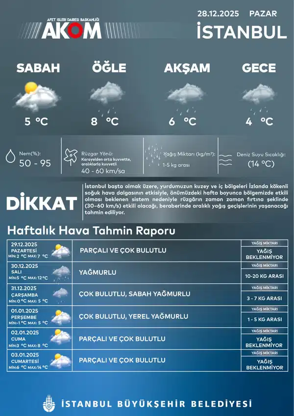 Haftalık tahmin raporuna göre, en yoğun yağışın beklendiği gün 30 Aralık Salı olacak (10-20 kg yağış). Yılbaşı gecesi ve yeni yılın ilk gününde ise termometreler donma noktasını görecek.