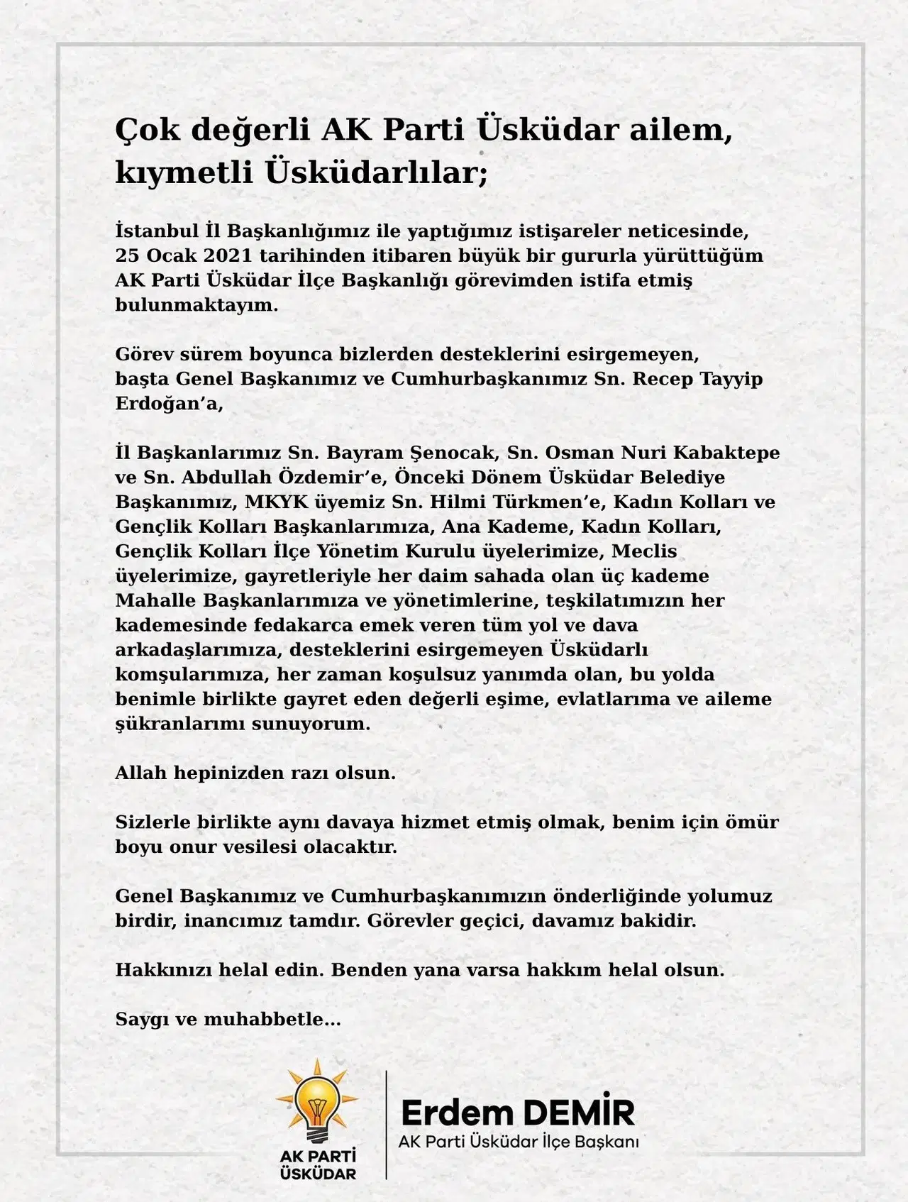 İstanbul İl Başkanlığımız ile yaptığımız istişareler neticesinde, 25 Ocak 2021 tarihinden itibaren büyük bir gururla yürüttüğüm AK Parti Üsküdar İlçe Başkanlığı görevimden istifa etmiş bulunmaktayım.