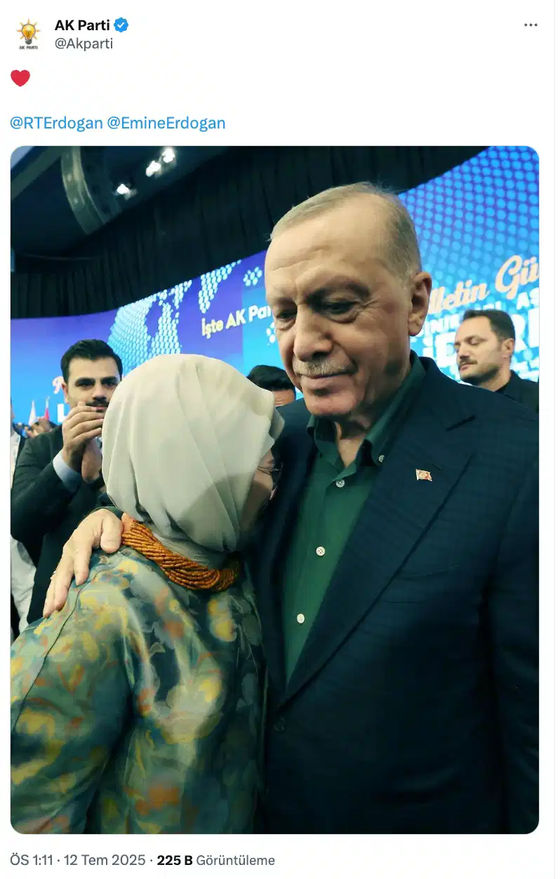 AKP’nin resmi sosyal medya hesabından da Emine Erdoğan’ın Tayyip Erdoğan’a sarıldığı fotoğraf paylaşıldı.