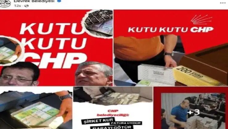 AKP’li Zonguldak Devrek Belediye Başkanlığı sosyal medyadaki resmi internet sitesinden CHP aleyhine, “Kutu Kutu CHP”, “Hırsızlık için CHP”, “CHP belediyeciliği: Şirket kur, Fatura Uydur, Parayı Götür /Hırsızlık için CHP”, “Yolsuzluk Belediyeciliği”, “Baklava Belediyeciliği” gibi görselleri paylaştı.